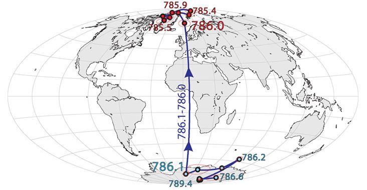 Nun haben jedoch Wissenschaftler der kalifornischen Universität Berkeley entdeckt, dass die letzte Umpolung, vor zirka 786.000 Jahren, sehr schnell stattfand – ungefähr während eines Menschenlebens. Eine internationale Studie unter der Leitung von amerikanischen Wissenschaftlern, untersuchte Sedimentschichten von magnetisch sensiblen Mineralien eines alten Sees im Sulmona-Becken, östlich von Rom, nicht weit der vom Erdbeben im Jahre 2010 zerstörten Stadt L’Aquila. Die magnetisch sensiblen Sedimente haben Spuren der Feldlinien des Erdmagneten quasi „eingefroren“, und zeigen so dessen frühere Ausrichtung.