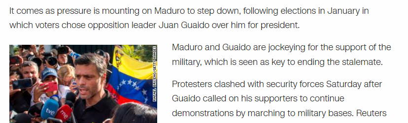 In einer Meldung, in der über den Absturz eines venezolanischen Militärhubschraubers am Samstag berichtet wurde, verstieg sich CNN zu der Aussage, dass Präsident Nicolás Maduro zunehmend unter Druck gerate, zurückzutreten, seit die Wähler Oppositionsführer Juan Guaidó bei Wahlen im Januar ihm gegenüber den Vorzug gegeben hätten.
