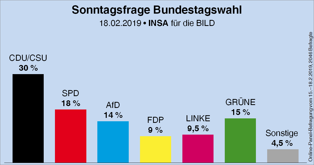 Der von Emnid für Bild am Sonntag durchgeführte "Sonntagstrend" bestätigt diesen Befund. Laut Emnid legt die SPD von 17 auf 19 Prozent zu, während die Grünen von 17 auf 15 Prozent abstürzen. Auch hier liegt die Union mit 30 Prozent vorn, bleibt allerdings unverändert. Es folgen die AfD mit unveränderten 13 Prozent, die Linke mit 10 (+1) und die FDP mit 8 Prozent (-1).