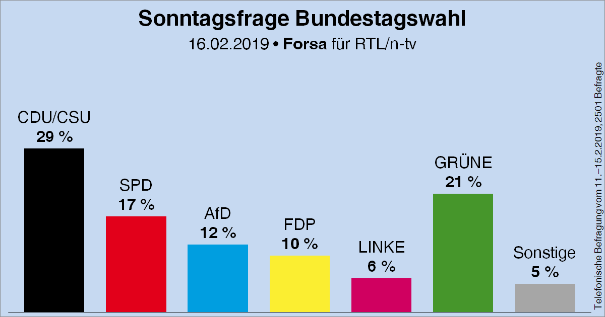 Eine Forsa-Umfrage vom Wochenende für RTL und n-tv sieht ebenfalls deutliche Gewinne der SPD, macht allerdings andere Verlierer aus als die Konkurrenz. Bei Forsa verliert die Union zwei Prozentpunkte auf 29 Prozent, die SPD gewinnt zwei auf 17 Prozent, liegt aber hier noch hinter den Grünen, die ebenfalls zwei Prozentpunkte auf nun 21 Prozent zulegen können. Unverändert bleiben die AfD mit 12 und die FDP mit 10 Prozent, die Linke stürzt dagegen von 8 auf 6 Prozent ab und läge nur noch knapp über der Fünfprozenthürde.