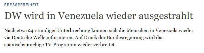 Zusammenfassend bleibt festzuhalten: Die Deutsche Welle bauscht das 24-stündige Ausbleiben ihres Sendesignals über einen der privaten Vertriebskanäle vor Ort und in einer Zeit unvorhersehbarer Stromausfälle zu einer Staatsaffäre auf, beschuldigt in sehr expliziten Worten die Maduro-Regierung der Zensur, die ihr unterstellte Rundfunkbehörde des bewussten Ausschaltens des Kanals, ohne dafür mehr Hinweise zu haben, als den Tweet der oppositionsnahen Journalisten-Gewerkschaft SNTP. Hinweisen ihrer eigenen Zuschauer, dass das DW-Programm – außer beim Anbieter DirecTV – sehr wohl ohne Unterbrechung in Venezuela empfangen wurde, wird nicht nachgegangen, sie werden einfach ignoriert. Zu passend und zu verlockend war wohl die Möglichkeit, weiter am Narrativ des "diktatorischen Maduro-Regimes" zu basteln, welches die "freie Presse" knebelt. In der "Diktatur" Venezuelas sind übrigens noch immer 80 Prozent aller TV- und Printmedien in privater Hand und stehen zum überwiegenden Teil der Opposition nahe.