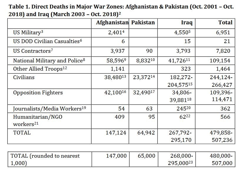 In Afghanistan sind der Studie nach 42.000 gegnerische Kämpfer umgekommen, ca. 2.400 US-amerikanische Soldaten und knapp 4.000 Angehörige privater Sicherheitsunternehmen. Den Großteil militärischer Opfer hat mit 58.000 Toten aber die nationale Armee beziehungsweise das afghanische Polizei zu verzeichnen.