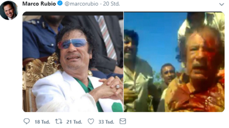 Zwischen zwei Tweets zu der Situation in Venezuela postete Rubio eine Fotomontage mit zwei Bildern des 2011 ermordeten libyschen Revolutionsführer Muammar al-Gaddafi. Das Bild auf der linken Seite zeigt Gaddafi während seiner Zeit als libysches Staatsoberhaupt. Das Bild auf der rechten Seite hingegen zeigt Gaddafi blutverschmiert kurz vor seiner Ermordung. Rubio postete die Fotomontage zwar ohne einen Kommentar – doch auch so dürfte klar sein, auf wen der US-Politiker damit anspielt.